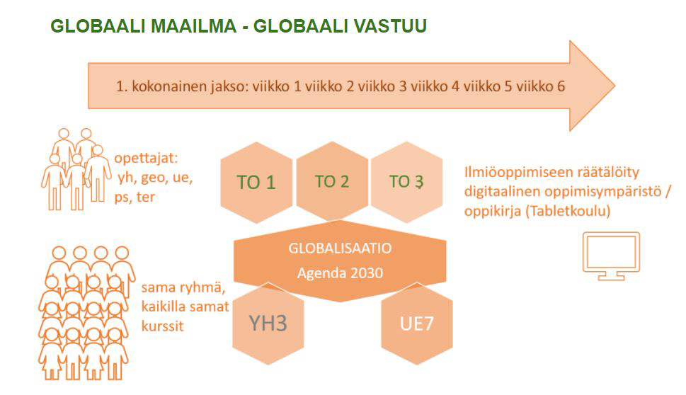 Seinäjoen lukiossa on toteutettu oppiainerajat ylittävää ilmiökeskeistä oppimiskokonaisuutta vuodesta 2010. Ajatus syntyi ennen ”ilmiöoppimisbuumia” ja ennen teemaopintojen olemassaoloa, kun mietittiin miten globalisaatioon liittyviä haasteita voisi parhaalla mahdollisella tavalla tehdä ymmärrettäväksi. Aiheen moninäkökulmaisuudesta johtuen eri oppiaineiden yhteistyö tuntui välttämättömältä, jotta ilmiöstä syntyisi jonkinlainen selkeä skeema ja asioiden välisiä syy-seuraussuhteita voisi ymmärtää. Teoreettisen tiedon lisäksi aihe tuntui vaativan osallistavaa toimintaa. Kokonaisuutta kehitellessä mietimme, miten globaaleja ongelmia voisi käsitellä niin, että avuttomuuden, välinpitämättömyyden ja toivottomuuden sijaan opiskelijoissa syttyisi myötätunto, halu oikeudenmukaisuuden edistämiseen ja ihmisoikeuksien kunnioittamiseen.