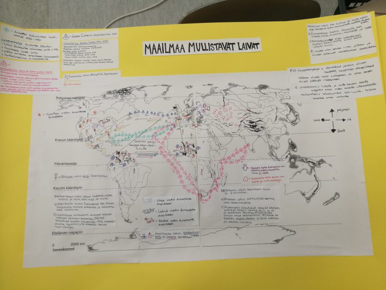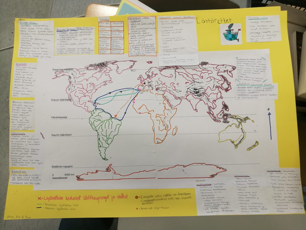 Kurssilla hyödynnetään runsaasti maantieteelle ominaista monipuolista geomediaa. Esimerkiksi löytöretkien aikakaudesta on tuotettu maantieteellinen teemakartta, jossa analysoidaan löytöretkien vaikutusta maailmankaupalle, ympäristölle ja yhteiskunnille. Lisäksi kurssilla on toteutettu yksilöllisesti arvioitavia töitä, kuten maantieteen valtiokoe ja teollistumista käsittelevä, vertaileva esseevastaus.