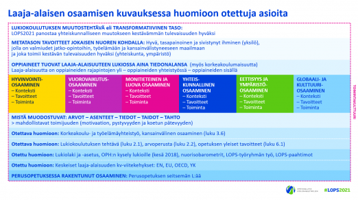 Kuvion pohjalle on eritelty laaja-alaisen osaamisen kuvauksessa huomioon otettuja ja sen muotoutumiseen vaikuttaneita asioita. Laaja-alaisen osaamisen osa-alueiden rivi osoittaa vaiheen, jolloin kuvaus on konkretisoitunut LOPSiin. Osa-alueiden rivin yläpuolella osoitetaan, miten laaja-alaisuus käytännössä toteutuu lukio-opinnoissa: oppiaineet tarjoavat varsinaiset sisällölliset ainekset, joiden tavoitteellinen sisäistäminen ja niiden yhteyksien rakentaminen kehittävät opiskelijan laaja-alaisuutta aina metatason tavoitteisiin asti. Ylin taso kuvaa, mitä laaja-alaisella osaamisella on lukiokoulutuksen jälkeen tarkoitus saada aikaan.