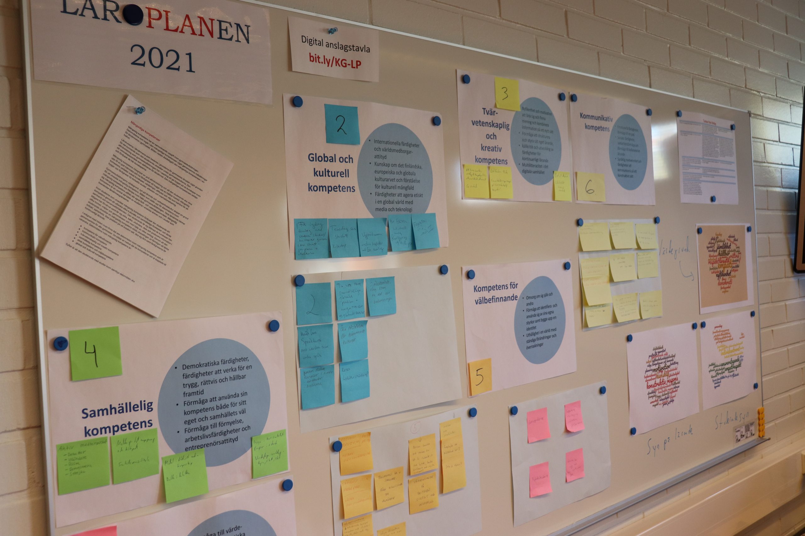 Vårt konkreta läroplansarbete inleddes alltså med ett pedagogiskt café med de mångsidiga kompetenserna i fokus. Vi hade redan tidigare sett över den nya läroplanens viktigaste hörnstenar tillsammans, så hela kollegiet hade en god uppfattning om vad det kommande arbetet skulle innebära. Inför caféet uppmanades alla lärare kort sammanfatta sin syn på var och en av de mångsidiga kompetenserna. Frågeställningen löd